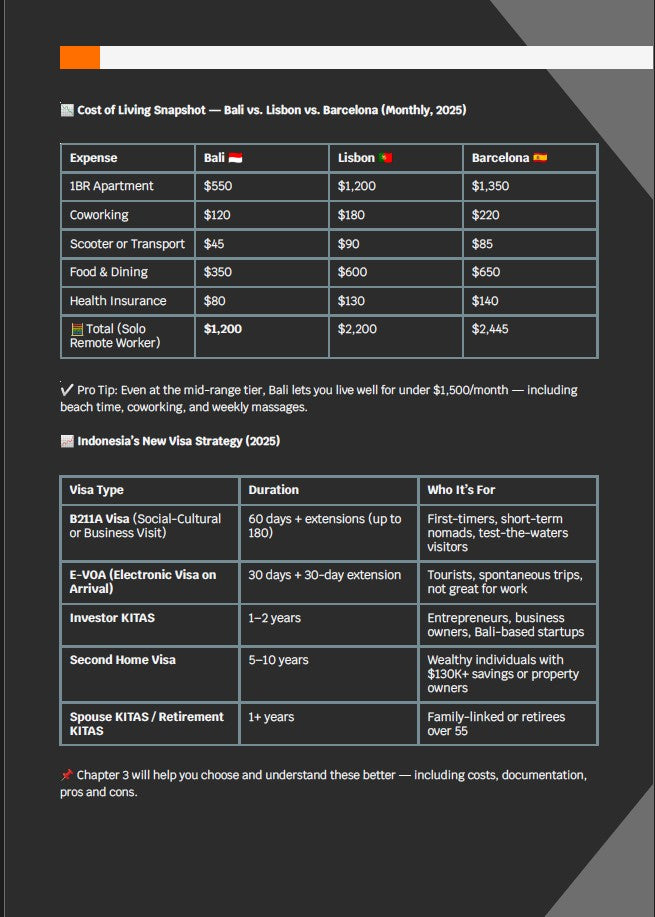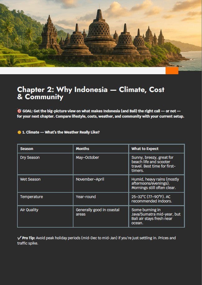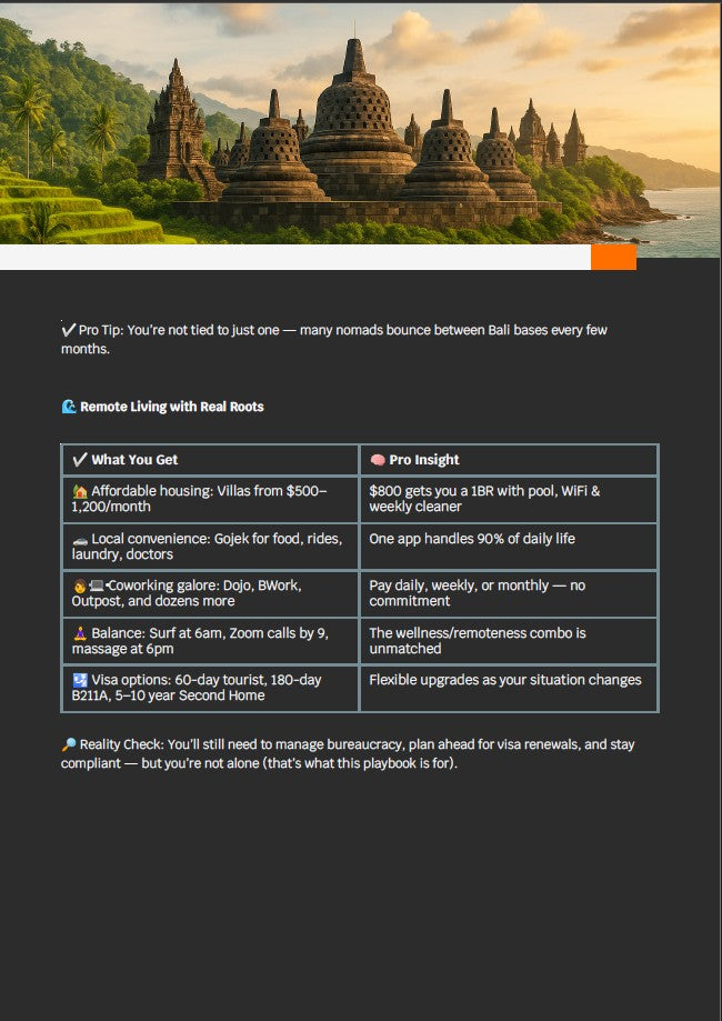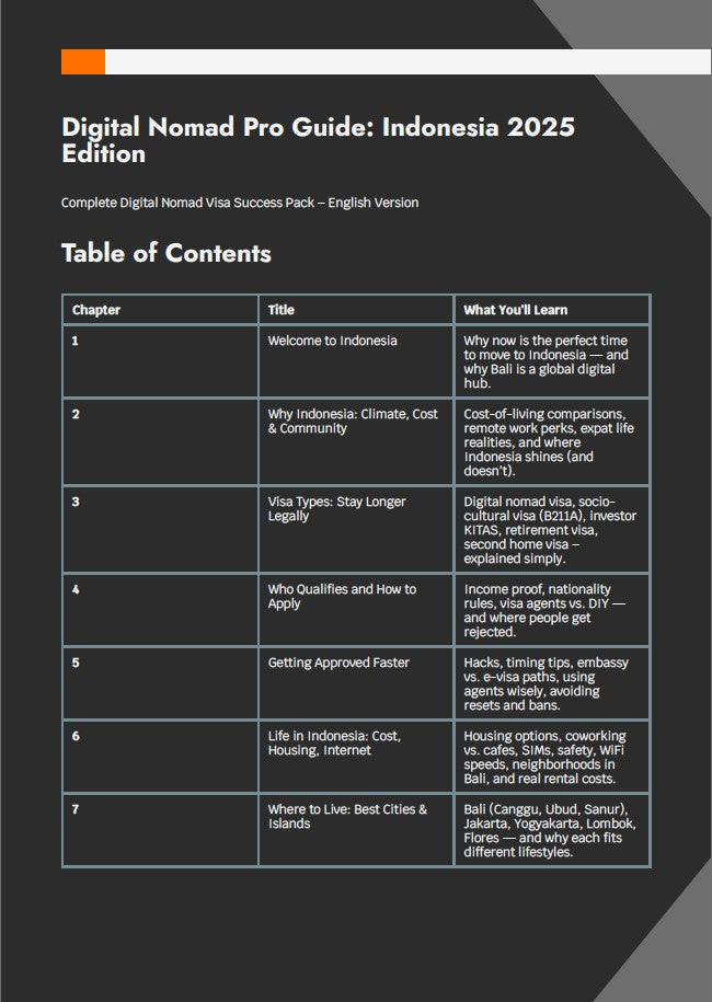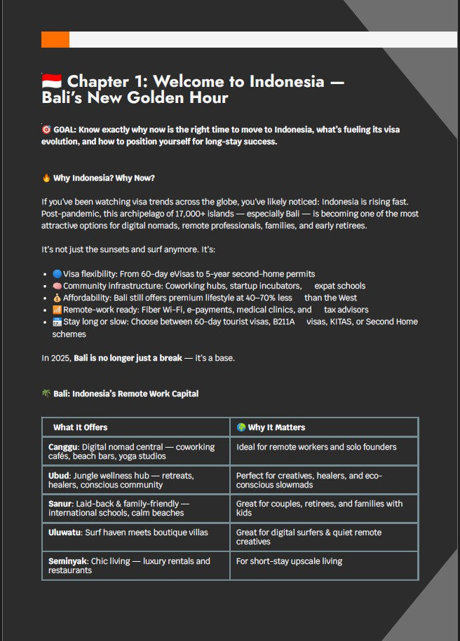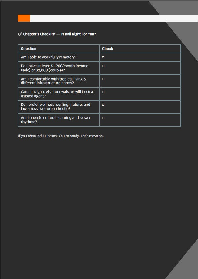 E: I chose Bali, then cross-checked the visa section and used the country-specific guide for Indonesia. It took me 17 days to resign, book my flight, pack, and move. That guide turned months of stress into two weeks of action.